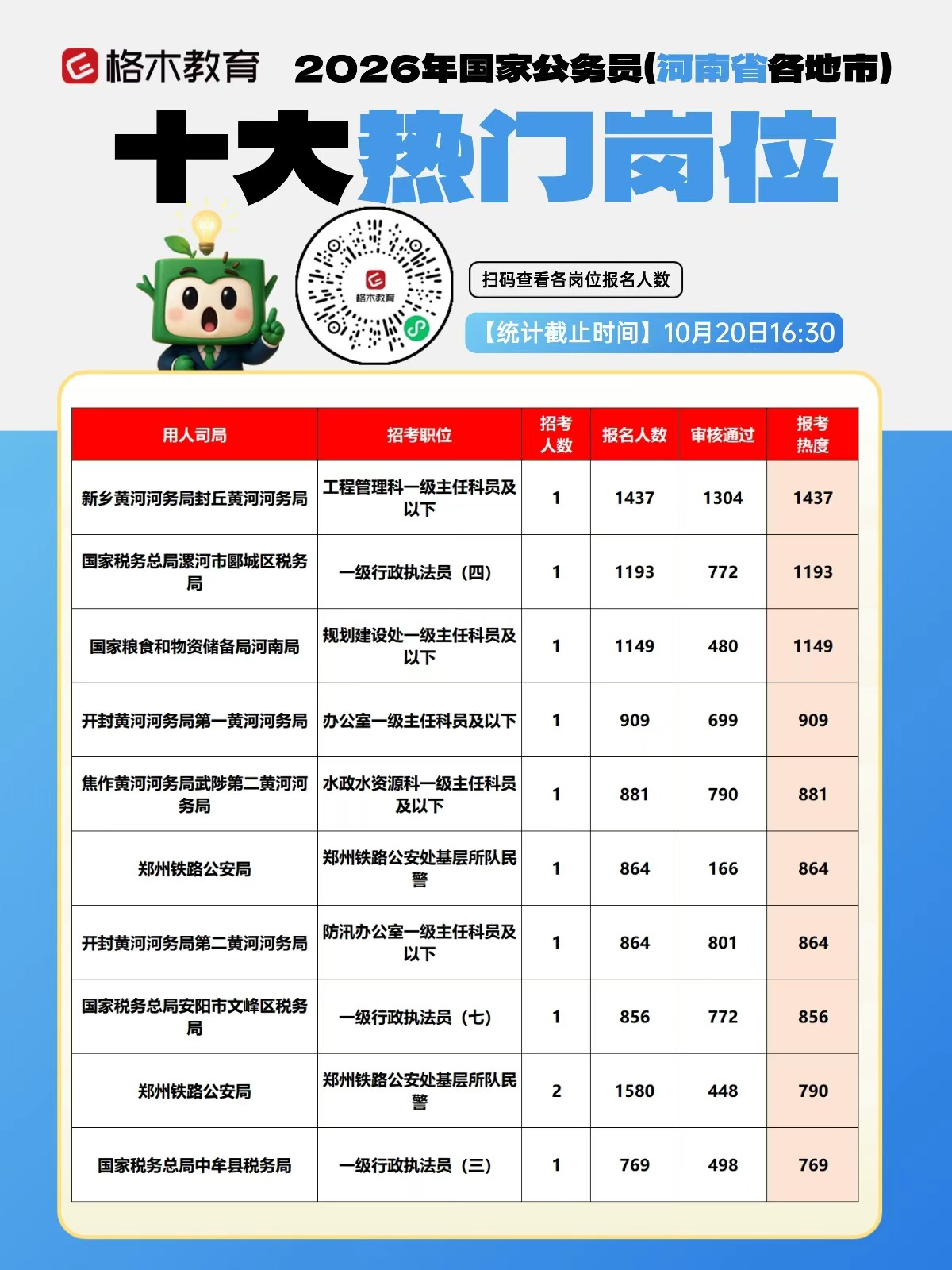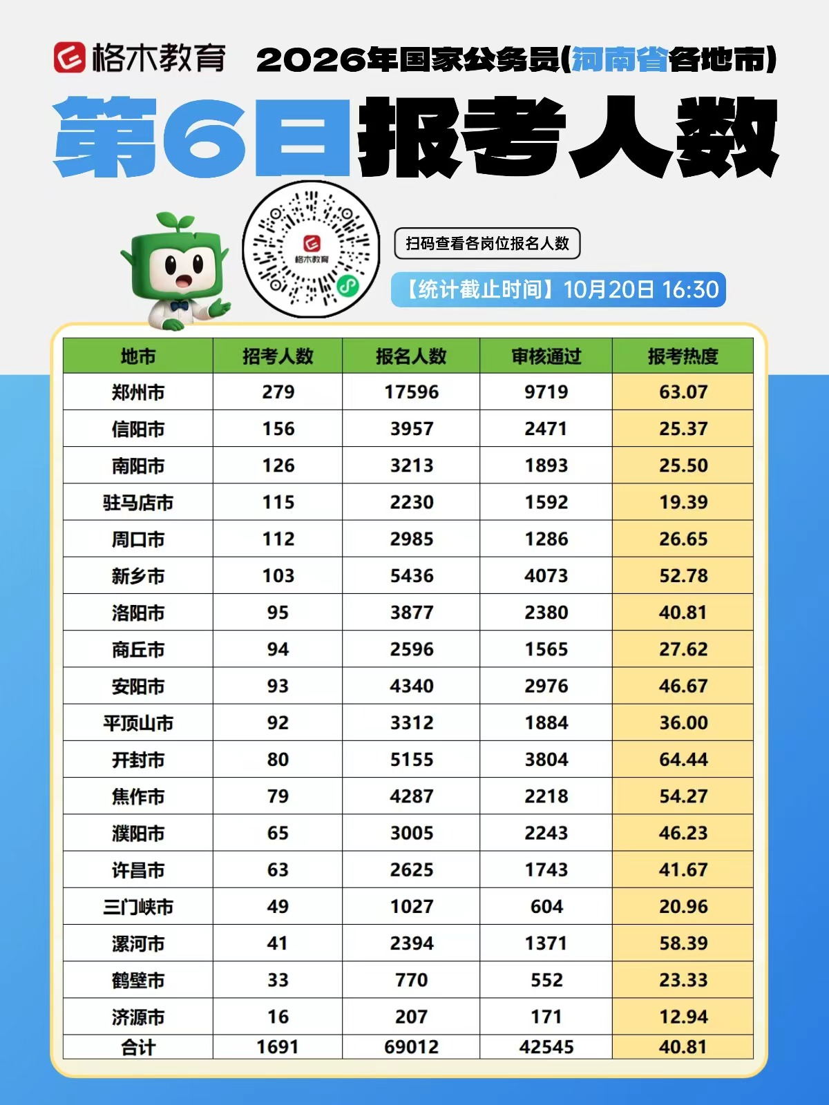 2026年国考报名人数统计:截至10月20日16:30时,河南招录1691人,报名人数69012人,审核通过42545人。